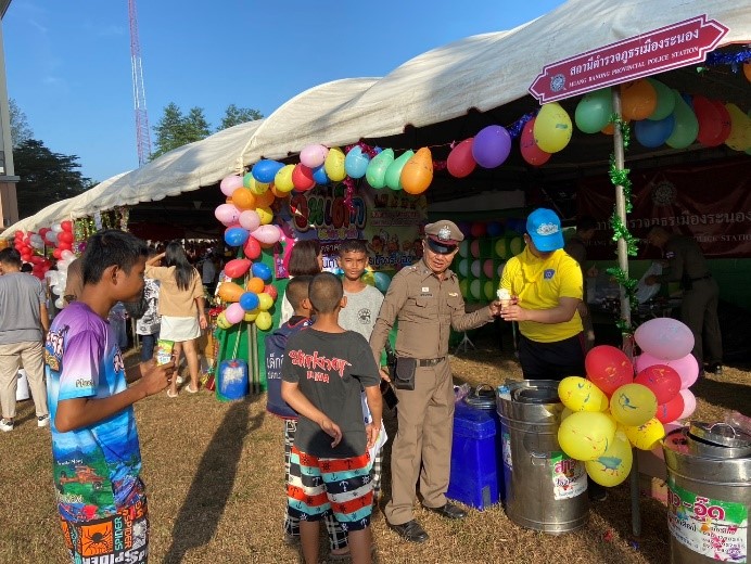 ปานดำ รอง ผกก.ป.สภ.เมืองระนอง , พ.ต.ต.สุรศักดิ์ บุญทองสังข์ สวป.สภ.เมืองระนอง,พ.ต.ท.นำชัย พุ่มแสง สว.อก.สภ.เมืองระนอง พ.ต.ต.ธันยวิชญ์ แทนมาก สว.จร.สภ.เมืองระนอง พร้อมช้าราชการตำรวจจิตอาสา สภ.เมืองระนอง จัดซุ้มงานวันเด็ก โดยมีกิจกรรมเล่นเกม แจกของขวัญ แจกไอศกรีม ณ ศูนย์ราชการจังหวัดระนอง