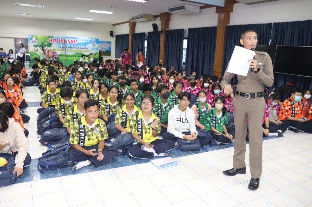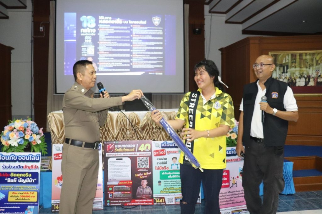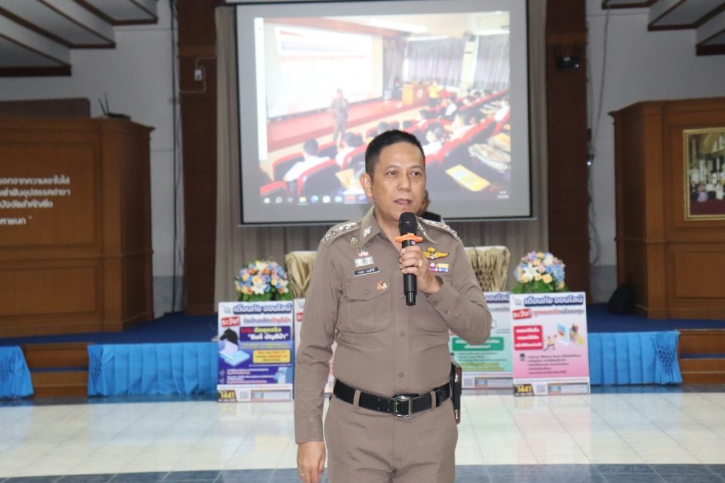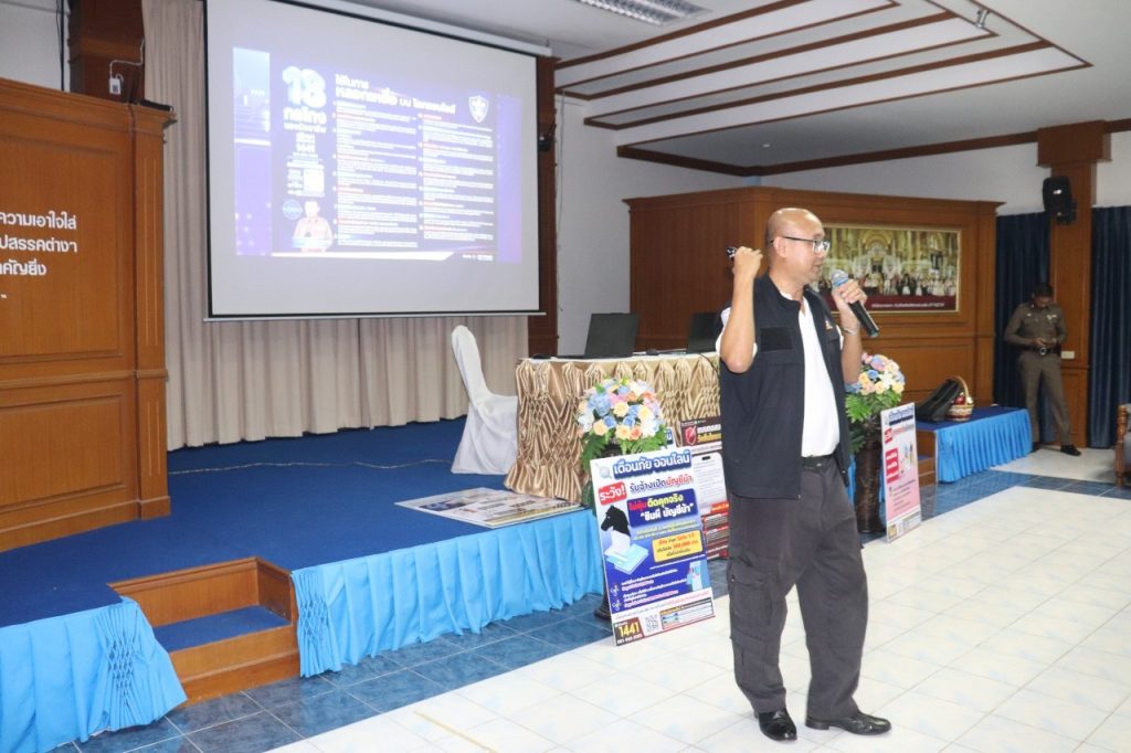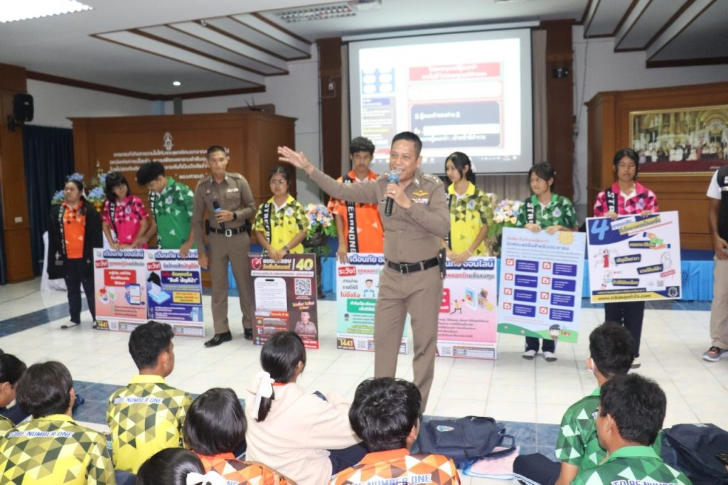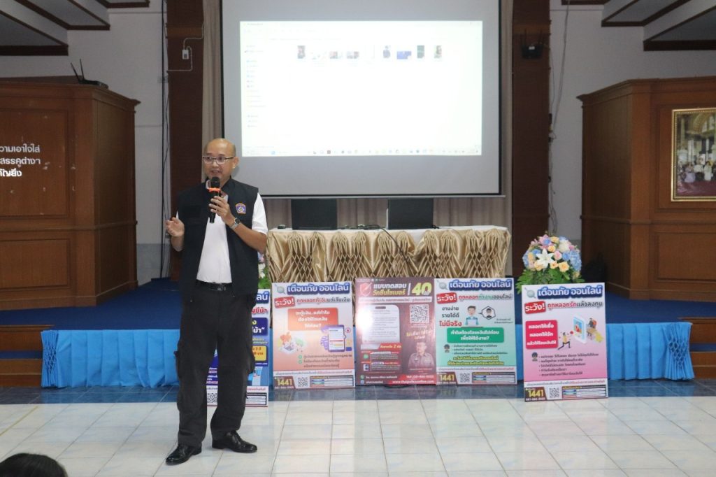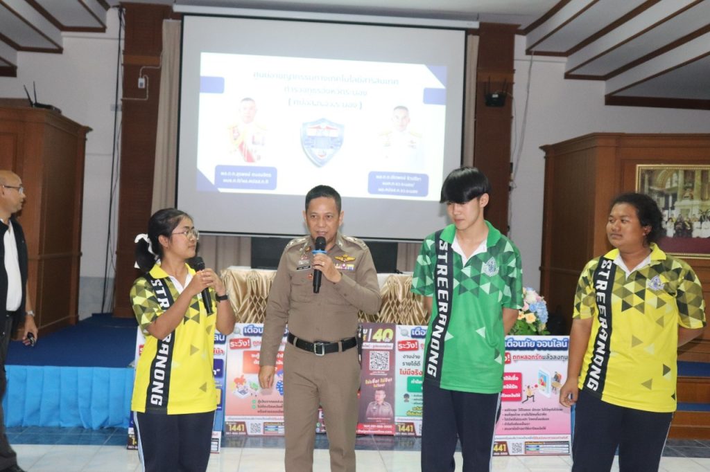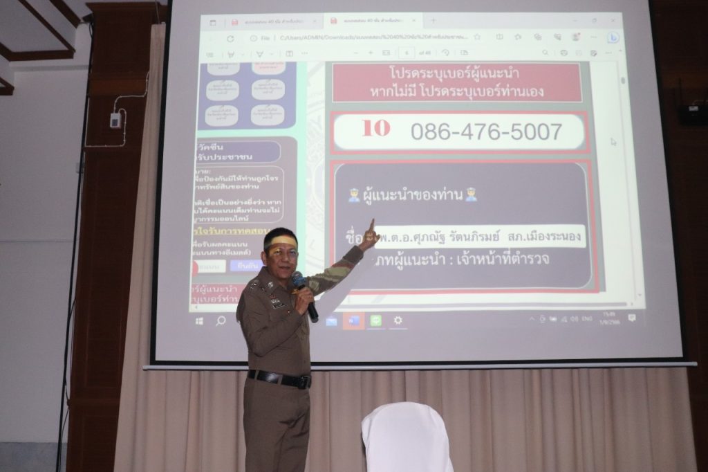 วันที่ 1 กันยายน 2566 เวลา 14.30-16.00 น. พ.ต.อ.ภคยศ ทนงศักดิ์ รอง ผบก.ภ.จว.ระนอง, พ.ต.ท.หญิงจารุวรรณ มากยงค์ รอง ผกก.(สอบสวน) สภ.เมืองระนอง พร้อมข้าราชการตำรวจ สภ.เมืองระนอง ทุกแผนกงาน ประกอบด้วย งานป้องกันปราบปรามฯ, งานสอบสวนฯ, งานสืบสวน, งานจราจรฯ และงานอำนวยการ ร่วมประชาสัมพันธ์และบรรยายให้ความรู้ ในเรื่อง รูปแบบ 18 กลโกงของมิจฉาชีพ สร้างภูมิคุ้มกันวัคซีนไซเบอร์ รู้ทันกลโกง “ไม่เชื่อ ไม่รีบ ไม่โอน” แก่นักเรียนโรงเรียนสตรีระนอง ณ ห้องโสตทัศนศึกษาโรงเรียนสตรีระนอง พร้อมทั้งเชิญชวนให้คณะ ครู นักเรียน ร่วมสมัครทำแบบทดสอบวัคซีนไซเบอร์ 40 ข้อ สร้างเครือข่ายป้องกันกลโกงทางไซเบอร์ เพื่อป้องกันการถูกหลอกลวงออนไลน์ ไม่ให้ตกเป็นเหยื่อของอาชญากร ต่อไป