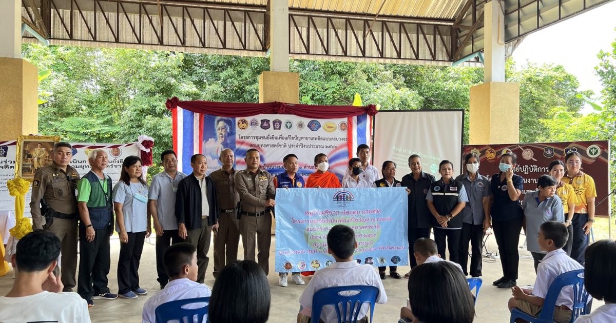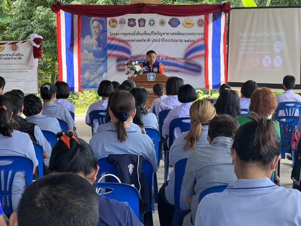 ยาเสพติดแบบครบวงจรตามยุทธศาสตร์ สภ.เมืองระนอง ประจำปีงบประมาณ 2566 ณ ศูนย์ปฏิบัติการชุมชนยั่งยืนฯ หมู่ 3 ต.บางนอน อ.เมือง จ.ระนอง โดยได้รับเกียรติจากนายปะกาศิต พรประสิทธิ์ นายอำเภอเมืองระนอง เป็นประธานในพิธี และมีหัวหน้าส่วนราชการที่เกี่ยวข้อง พร้อมประชาชนในพื้นที่เข้าร่วมในพิธีปิดโครงการฯ ด้วย