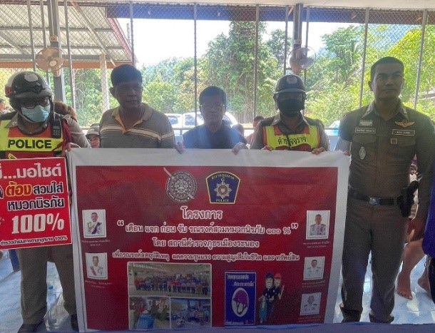 วันที่ ๙ เมษายน ๒๕๖๗ เวลา ๑๓.๐๐ น. พ.ต.อ.ธวัชชัย ซุ้นเจริญ ผกก.สภ.เมืองระนอง พ.ต.ท.ชาตรี ปานดำ รอง ผกก.ป. สภ.เมืองระนอง ได้สั่งการให้ พ.ต.ต.ธันยวิชญ์ แทนมาก สว.จร.สภ.เมืองระนอง พร้อมเจ้าหน้าที่จราจร สภ.เมืองระนอง ร่วมกับผู้ใหญ่บ้าน ผู้นำชุมชุน ม.๑ ต.บางนอน อ.เมือง จ.ระนอง บริษัทกลางฯ รณรงค์/ประชาสัมพันธ์การสวมหมวกนิรภัย ๑๐๐% และให้ความรู้เกี่ยวกับการใช้รถใช้ถนน ตามโครงการ เตือน แจก ก่อนจับ รณรงค์สวมหมวกนิรภัย ๑๐๐%